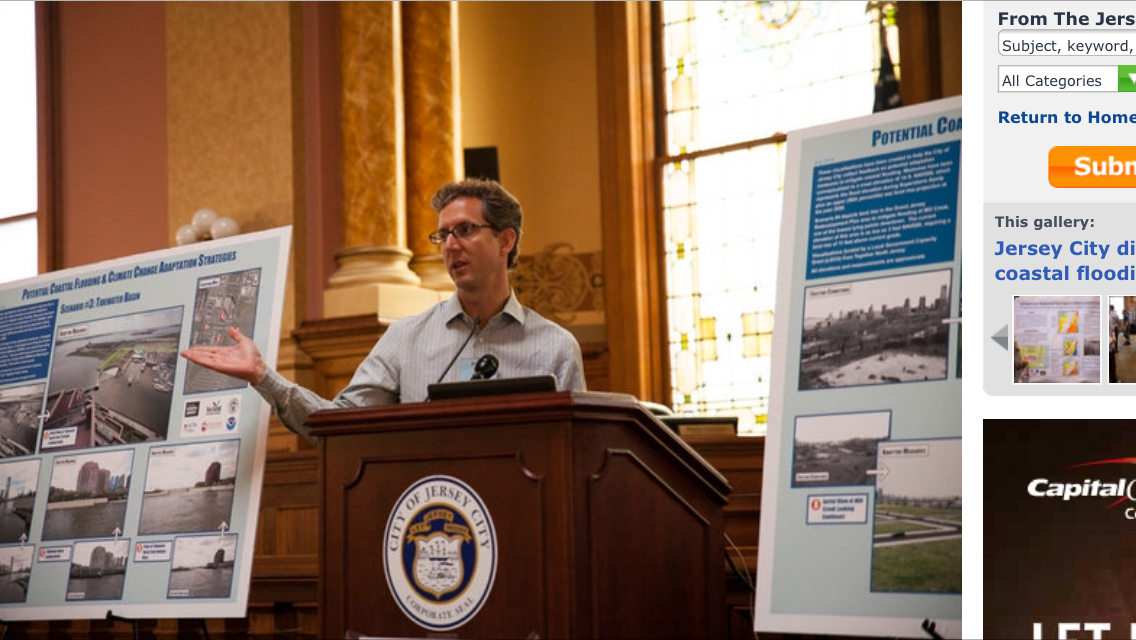 Photograph of Philip Orton presenting at City Hall, at one of the public meetings where Jersey City Planners and Stevens Researchers presented options for reducing the chances of storm surge flooding.